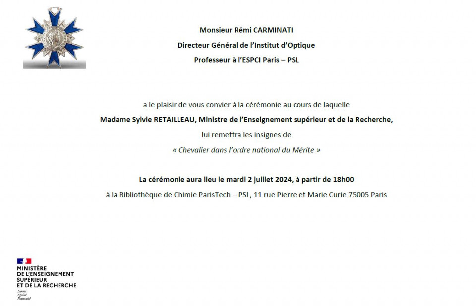 Le 2 juillet dernier, a eu lieu la cérémonie durant laquelle Madame Sylvie Retailleau, Ministre de l'Enseignement Supérieur et de la Recherche, a remis à Monsieur Rémi Carminati, Directeur de l'Institut d'Optique G.S. et professeur à l'ESPCI Paris-PSL, les insignes de "Chevalier dans l'ordre national du Mérite", une distinction qui vient honorer son parcours remarquable et ses contributions significatives au domaine de la recherche scientifique.