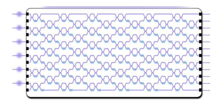 Au moyen d’un démultiplexeur, les photons uniques sont envoyés séquentiellement dans 6 fibres optiques. Ces fibres optiques sont également des lignes à retard permettant aux 6 photons d’être injectés simultanément dans une série d’interféromètres programmables (de type Mach-Zehnder) qui réalisent les portes quantiques en faisant interférer les photons.