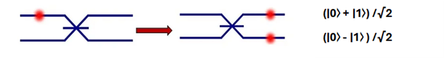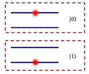 • Les qubits de Quandela utilisent la technique dite « dual-rail ». Un qubit est constitué par deux guides d’onde (mode de propagation du champ). Le guide d’onde du haut est l’état ∣0⟩, le guide d’onde du bas est l’état ∣1⟩. Le photon unique circule dans l’un des deux guides d’onde.