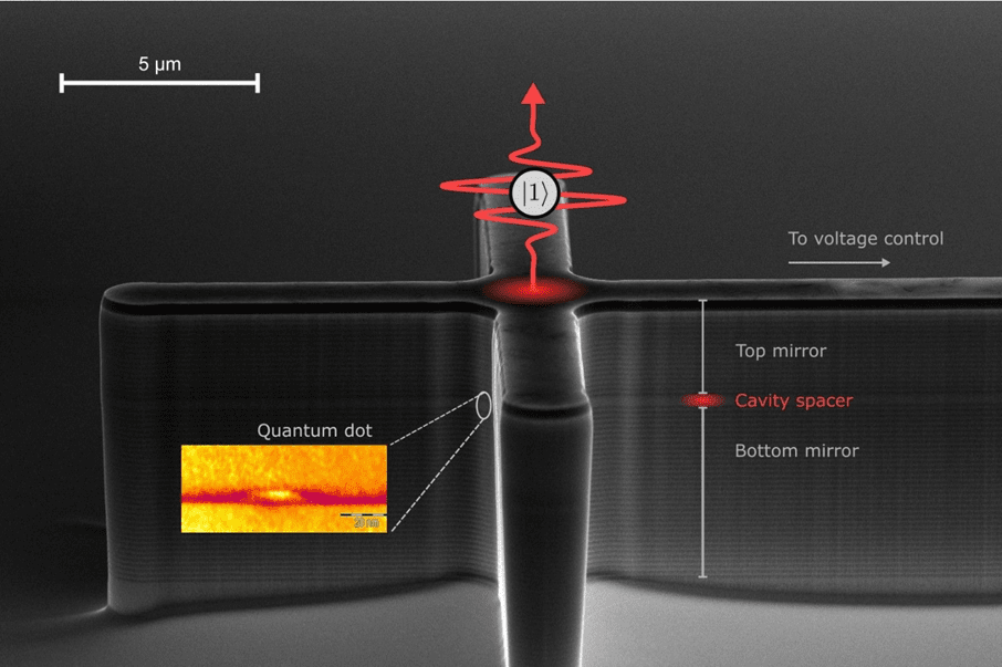 Une impulsion laser excite un électron, qui en se désexcitant génère un photon unique. La source est en fait un pilier composé de couches multiples qui forment une cavité optique qui guide le photon dans une direction précise. Cette cavité est couplée à une fibre optique qui permet de récupérer le photon.