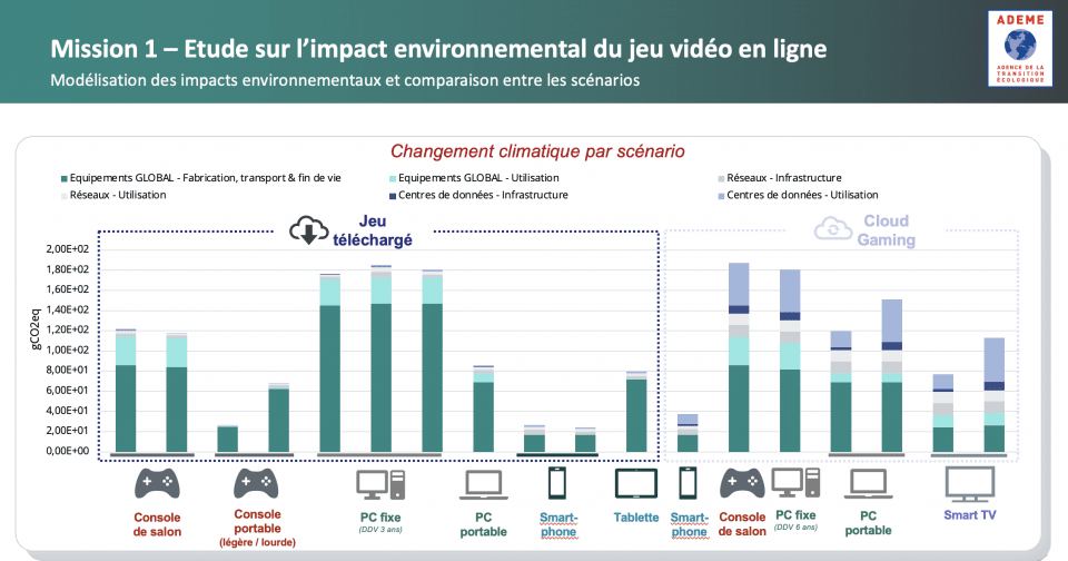 Réalisée pour l’ADEME (l’Agence de la transition écologique en France), cette mission avait pour but d’éclaircir les différences en termes d’impact environnemental du jeu vidéo, d’identifier sa place dans l’empreinte environnementale française (notamment vis-à-vis du secteur du numérique en général), et de mettre en évidence les principaux facteurs qui l’influence afin d’identifier des axes de réductions. Concrètement, il fallait définir des usages en faisant varier des paramètres tels que les équipements, le type de jeu et le mode d’accès pour obtenir des scénarios, puis évaluer leurs impact sur le changement climatique, l’épuisement des ressources, minéraux et métaux, la consommation d’énergie…