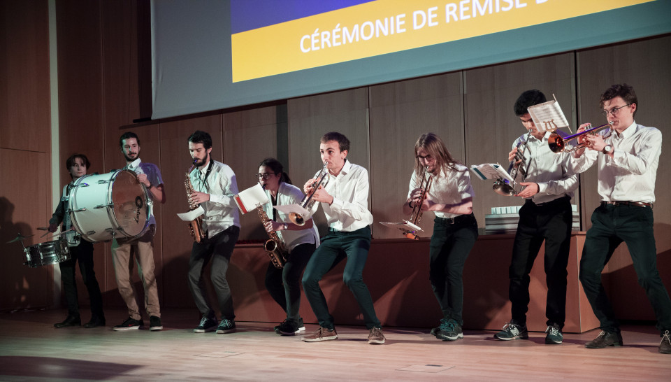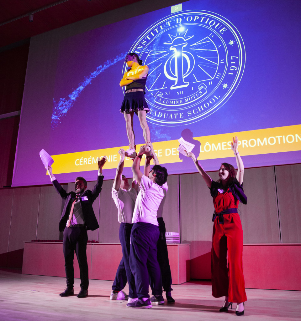 (Crédit photos : SupOptique Art Production /SOAP)Vendredi 10 décembre se tenait la cérémonie de remise des diplômes à la promotion 2021 de l’Institut d'Optique Graduate School d’Optique dans l’amphithéâtre de l’École normale supérieure Paris-Saclay.Une cérémonie forte en émotions où se sont succédés des moments solennels avec les interventions de Pierre Paul ZALIO (Président de l'École Normale Supérieure Paris-Saclay), Jean-Louis MARTIN (DG de l'Institut d'Optique Graduate School), Riad HAIDAR, promo 99, (DG adjoint à l’enseignement de SupOptique), Philippe METIVIER, promo 82, (Directeur technique de LUMIBIRD), et François-Hugues GAUTHIER, promo 76, (Président de SupOptique Alumni) ; Jean-Louis Martin Philippe Métivier François-Hugues GauthierMais aussi des moments festifs et musicaux avec la fanfare de SupOptique, le show PimPim, plusieurs interprétations musicales du talentueux duo Célia PELLUET, promo 20, et Baptiste CERISIER, promo 19, (dit "Ceryse") ainsi qu’une chorégraphie de Pierre Godet, promo 17, et Solène Bardin, promo 2019, toute en émotion ! Cinq Alumni (Emmanuel LE TAILLANDIER de GABORY, promo 99, Gabriel CHARLET, promo 99, Sophie BRASSELET, promo 94, Pascale BROCHARD, promo 91 et Clémentine BOUYE, promo 12) ont accepté de partager leur parcours et leur expérience par de courtes vidéos diffusées tout au long de la cérémonie. Merci à eux pour leur participation !Nous remercions chaleureusement toutes les personnes qui ont participé à l’organisation de cet évènement, L’ENS Paris-Saclay pour leur accueil, Coline GRASSIN et Cyril MALINET, tous deux de la promo 20, les sympathiques maîtres de cérémonie.Merci à Son et Lumières pour avoir sonorisé et illuminé la scène, le SOAP pour avoir immortalisé nos jeunes diplômés et LUMIBIRD (parrain de la promo 2021) pour les avoirs accompagnés durant leurs trois années à l’Ecole jusqu’à leur diplôme. Les maîtres de cérémonie Coline Grassin et Cyril MalinetPour finir, merci aux nouveaux référents de la promotion 2021 Bérénice RENARD et Jimmy MURARI qui ont accepté d'être nos contacts pour leur promotion. Ils aideront l'Association à garder le lien !Félicitations à tous ces nouveaux Alumni !