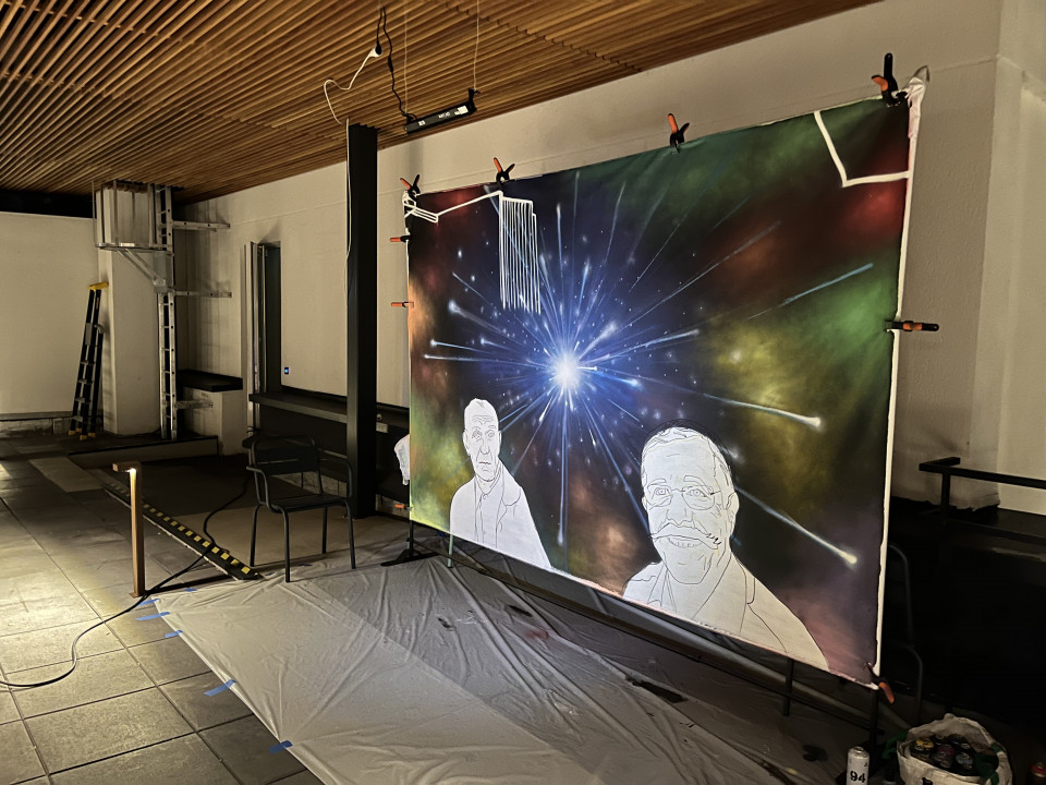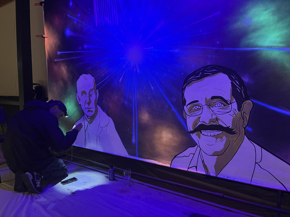 En soirée, pendant le cocktail une animation de live painting a été organisée et a permis la création d'une toile originale à la gloire de la Photonique, d'Alain Aspect et Alfred Kastler! Alain a pu découvrir ainsi son portrait fraîchement réalisé !